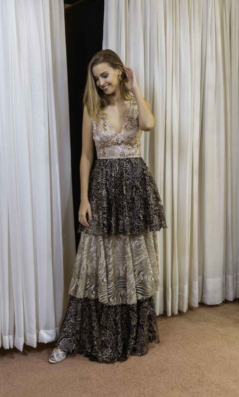 O Vestido de Festa com Babado Bicolor Anne Hathaway une preto e dourado em uma composição sofisticada, onde o jogo de cores constrói um contraste elegante e atemporal. A modelagem evasê com camadas de babados traz fluidez, enquanto o decote em V alonga o colo com leveza. A renda, aplicada com primor, adiciona textura e feminilidade. Uma peça que transita com naturalidade entre o clássico e o contemporâneo — ideal para madrinhas, formandas ou convidadas de eventos de gala.