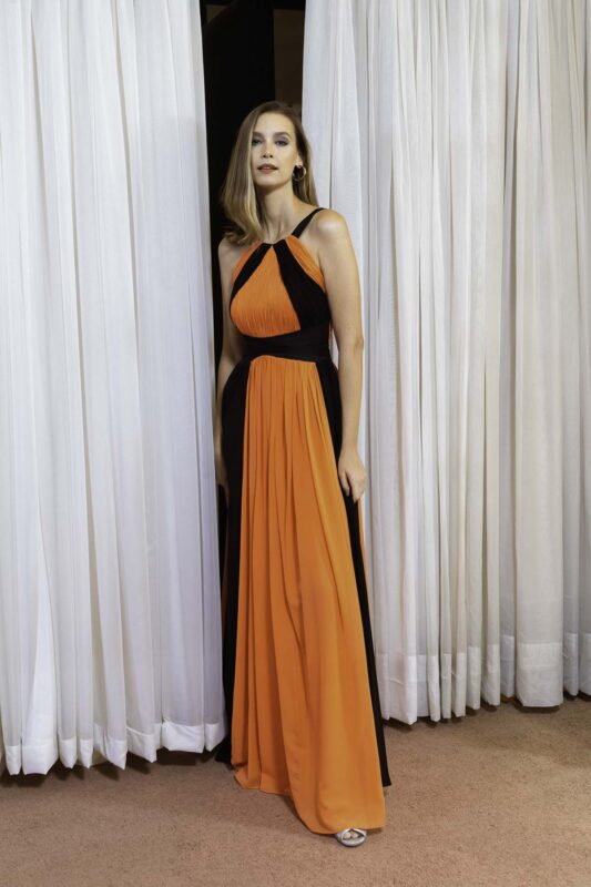 - Festas contemporâneas: Combinações vibrantes como laranja com preto criam impacto e revelam personalidade. Modelos com recortes modernos e fluidez são ideais para esses eventos.