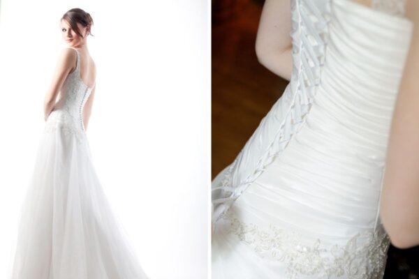 Outra vantagem é a possibilidade de realçar detalhes e adornos na parte superior do vestido, como rendas, bordados ou pérolas. A linha de cintura mais baixa permite que esses elementos se destaquem.