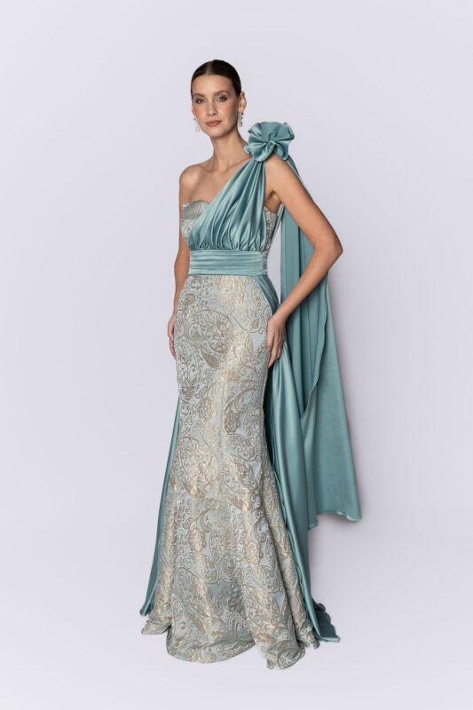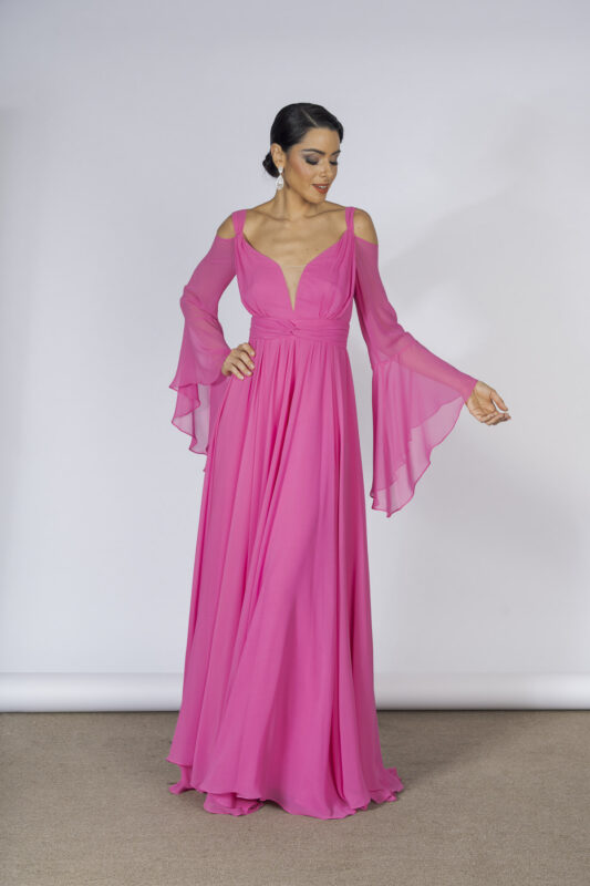 A semi sobrecapa em musseline cria um efeito sublime nas costas, trazendo fluidez ao visual sem perder a imponência. Confeccionado em alfaiataria com acabamento primoroso, esse modelo é ideal para irmãs da noiva que buscam um vestido impactante, mas equilibrado — sofisticado em cada detalhe, sem excessos.