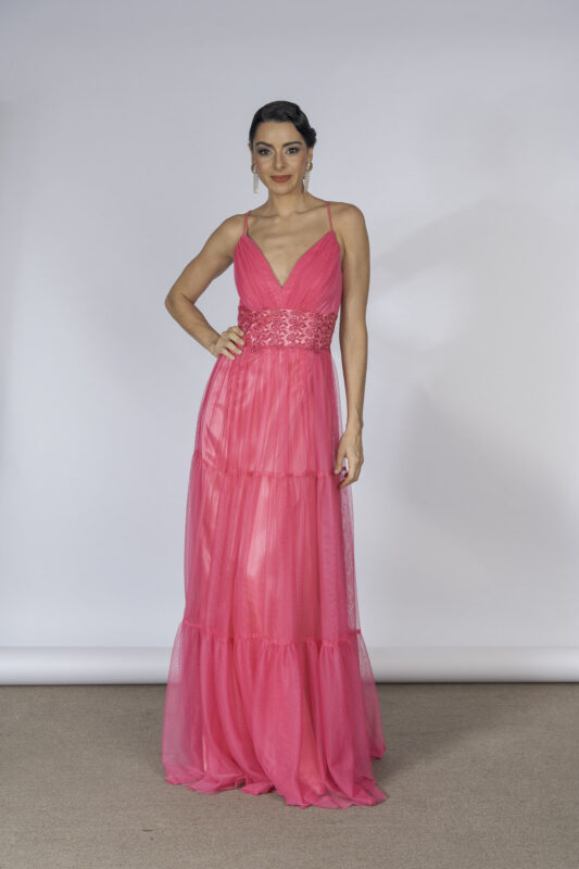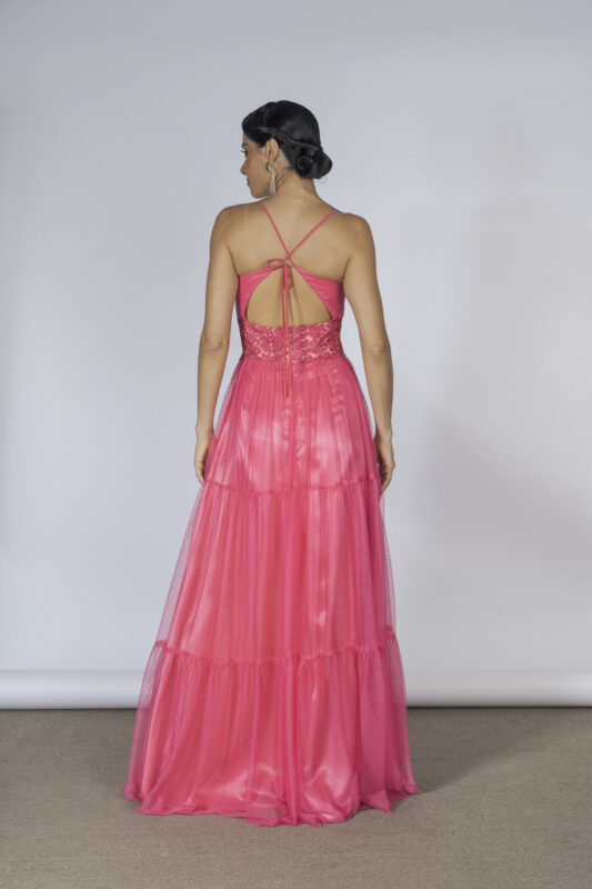 Confeccionado em tule leve na tonalidade rosa, o Vestido de Festa Rosa Titina Mariano traduz delicadeza com sofisticação.