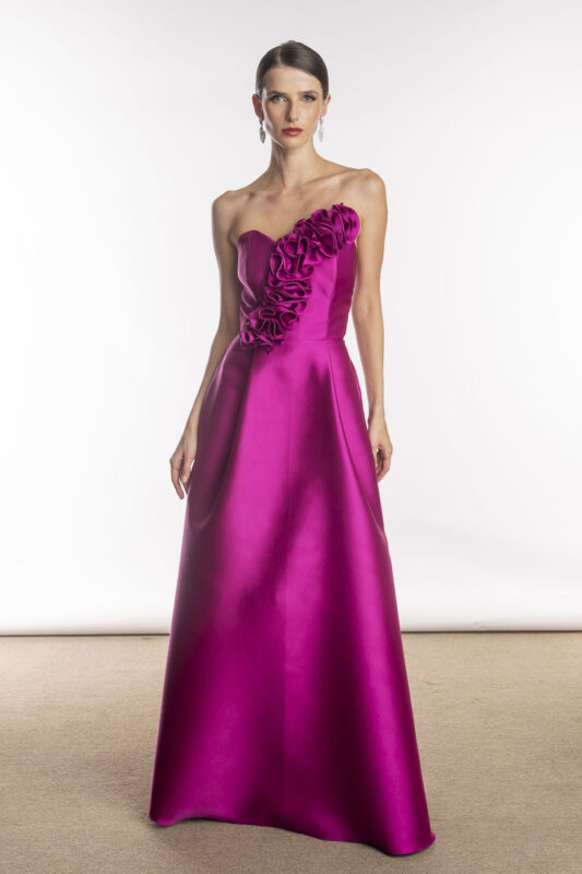O Vestido de Festa Fúcsia Wirna aposta na força do corte clássico com detalhes que atualizam o visual. Confeccionado em zibeline de alfaiataria, seu brilho acetinado discreto realça o tom fúcsia.