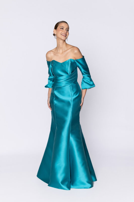 O Vestido de Festa Tássia apresenta uma leitura contemporânea do vestido sereia, com atenção especial aos volumes e ao contraste de formas. Confeccionado em zibeline verde oliva, tecido estruturado com acabamento acetinado, ele entrega um visual firme, bem construído e pouco convencional.