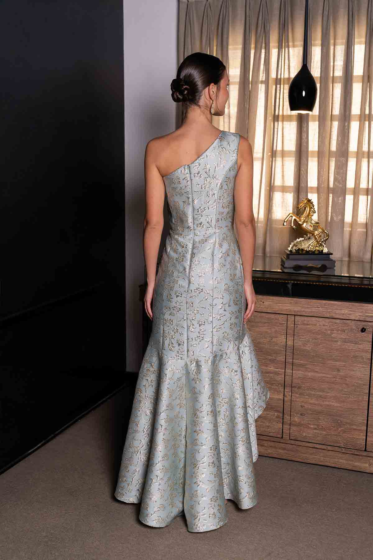 Vestido de festa comprimento mullet em jacquard texturizado exclusivo, modelo Pini Jordan é perfeito para você brilhar nas melhores ocasiões especiais como casamentos e bailes de formatura.