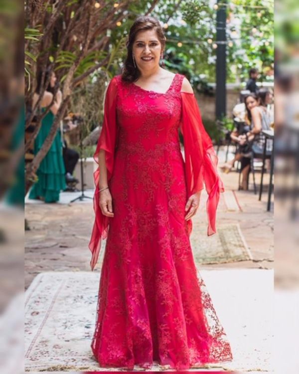O vestido de festa Curvy Queen é um modelo longo com modelagem sereia e mangas diferenciadas, possui uma cor vibrante e tule rendado.