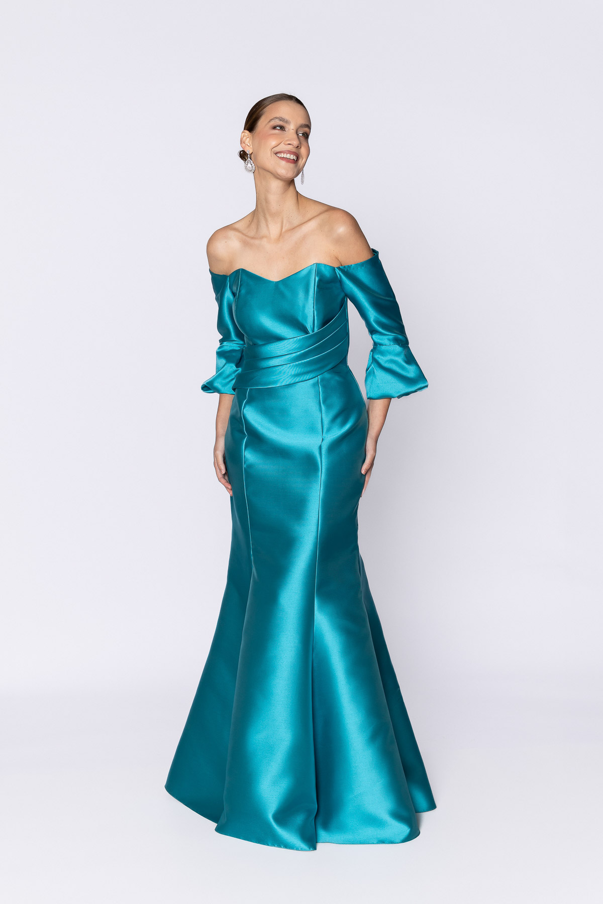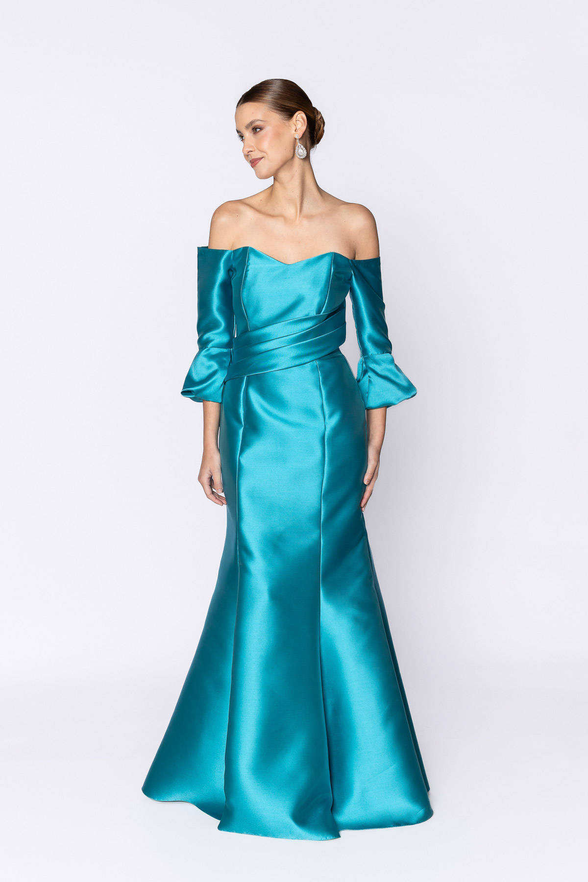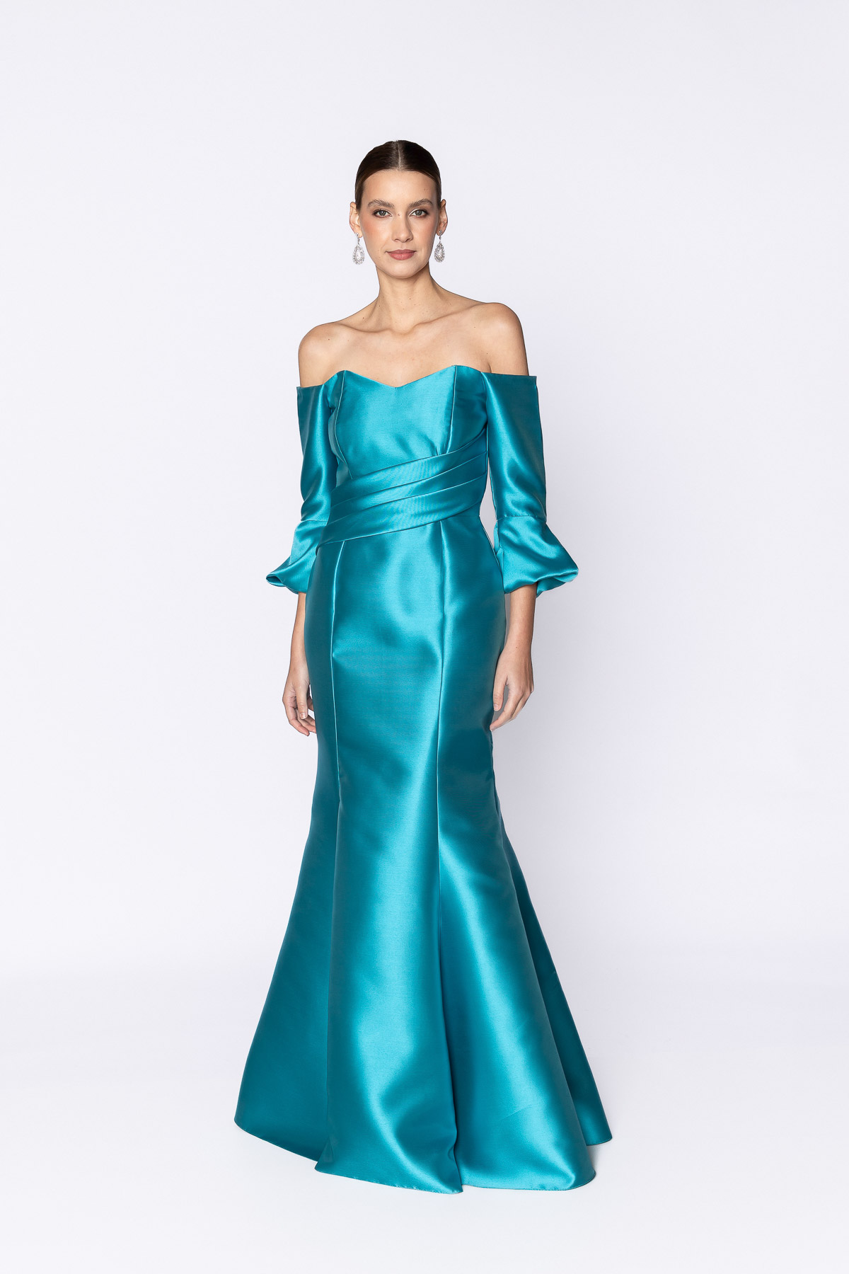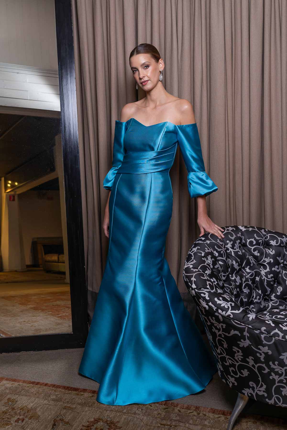 Vestido de festa longo com mangas em tecido de alfaiataria zibeline, na cor azul, o modelo Jessica Olsen é elegante e perfeito para mãe da noiva ou mãe do noivo brilhar no casamento.