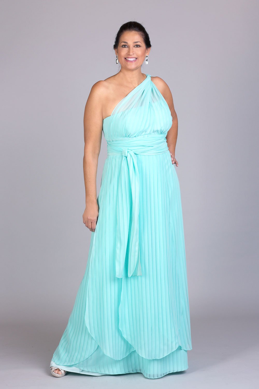 Vestido que se transforma em 3 versões diferentes para uso em ocasiões diferentes cor verde azulado