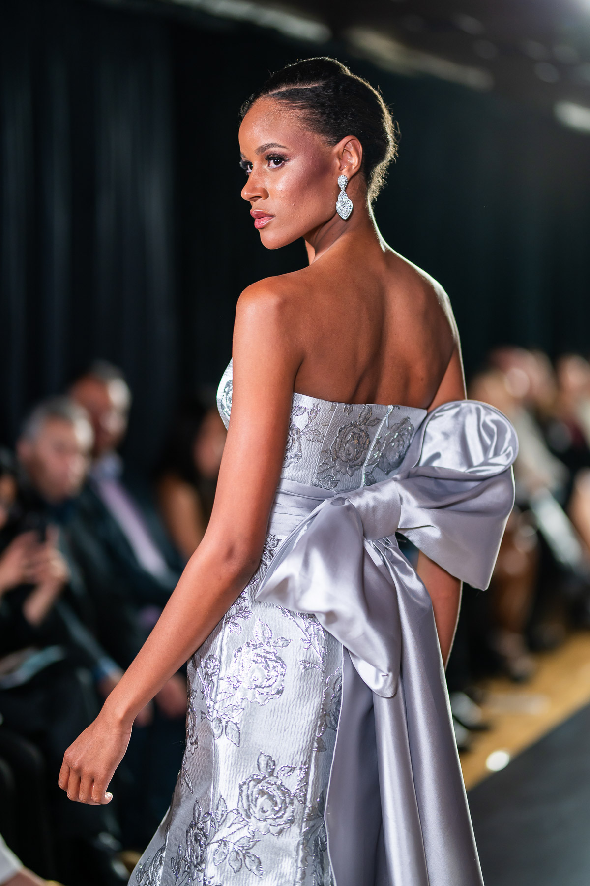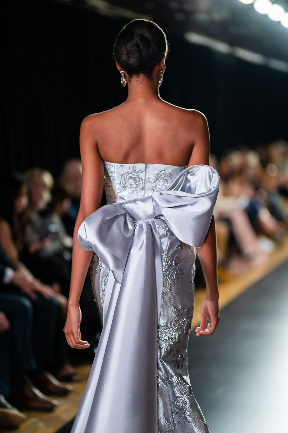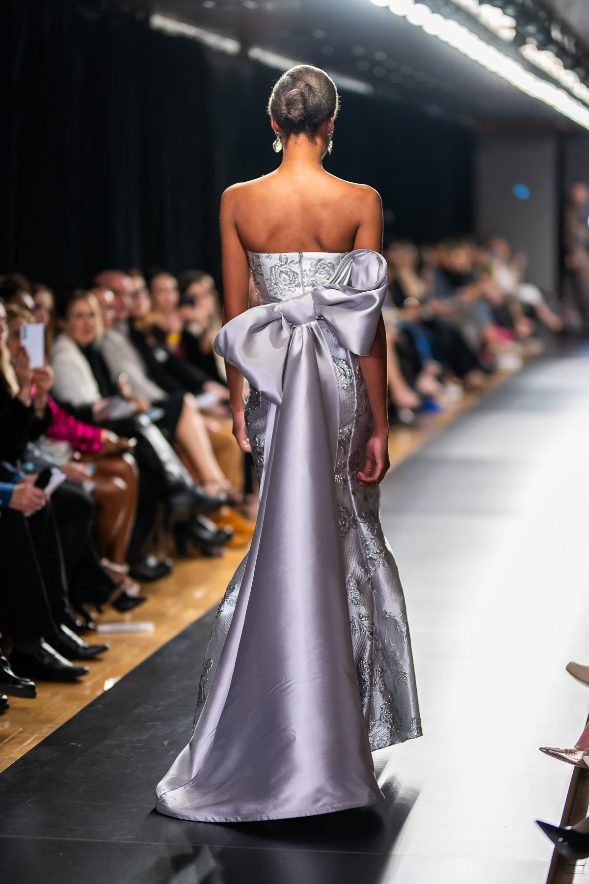 Vestido de festa longo, com maxi laço nas costas, decote tomara que caia em tecido jacquard exclusivo cor classic silver, esse modelo é perfeito para bailes de gala e formatura.