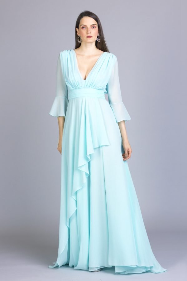 Vestido de festa longo com decote em V e manga longa e saia evase na cor azul tiffany