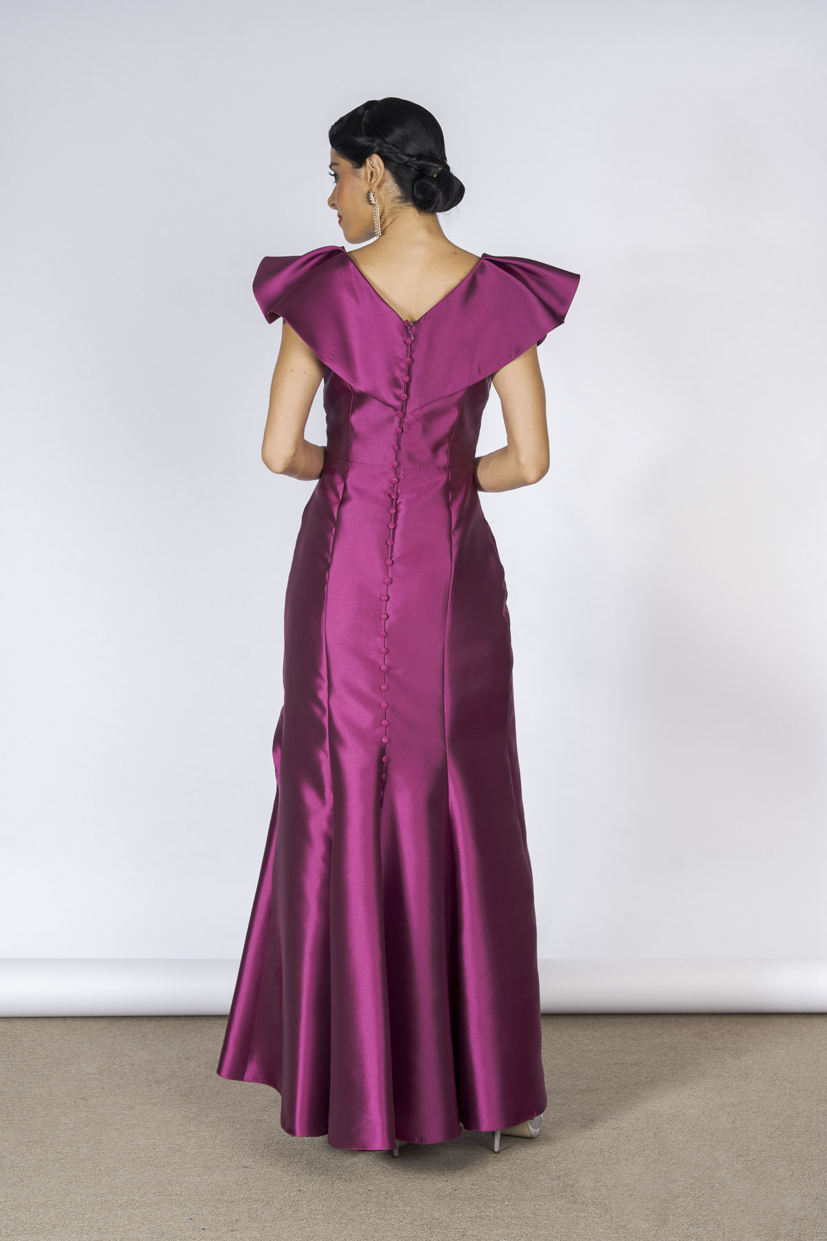 Vestido longo fúcsia em zibeline, com decote em V, pregas e babado feito à mão, além de botões decorativos nas costas. Ideal para madrinhas, mães dos noivos e convidadas de eventos formais.