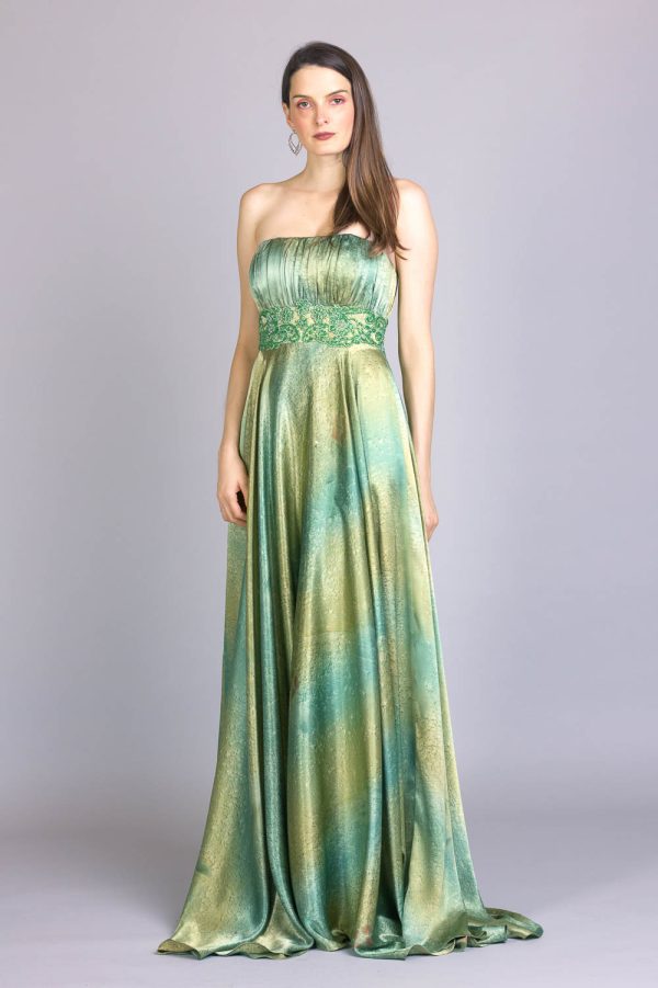 Vestido de festa longo estampado, tomara que caia, com pala na cintura, com aplicação de renda manualmente e bordado feito a mão