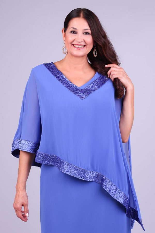 Vestido de festa midi, modelo gigi gasparini na cor azul confeccionado em chiffon, este elegante modelo pode ser usado com capa decote em V bordada a mão ou sem a capa.