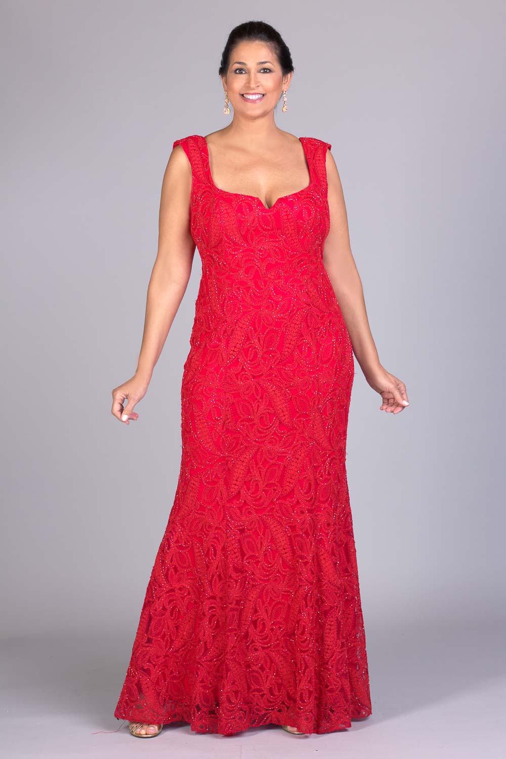 Vestido longo de renda vermelho, com modelagem sereia que valoriza a silhueta, todo bordado a mão.