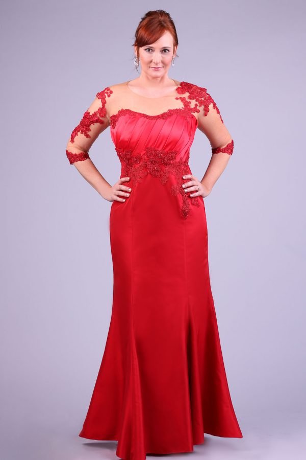 Vestido de festa longo vermelho em zibeline com transparências e aplicações de renda, saia sereia