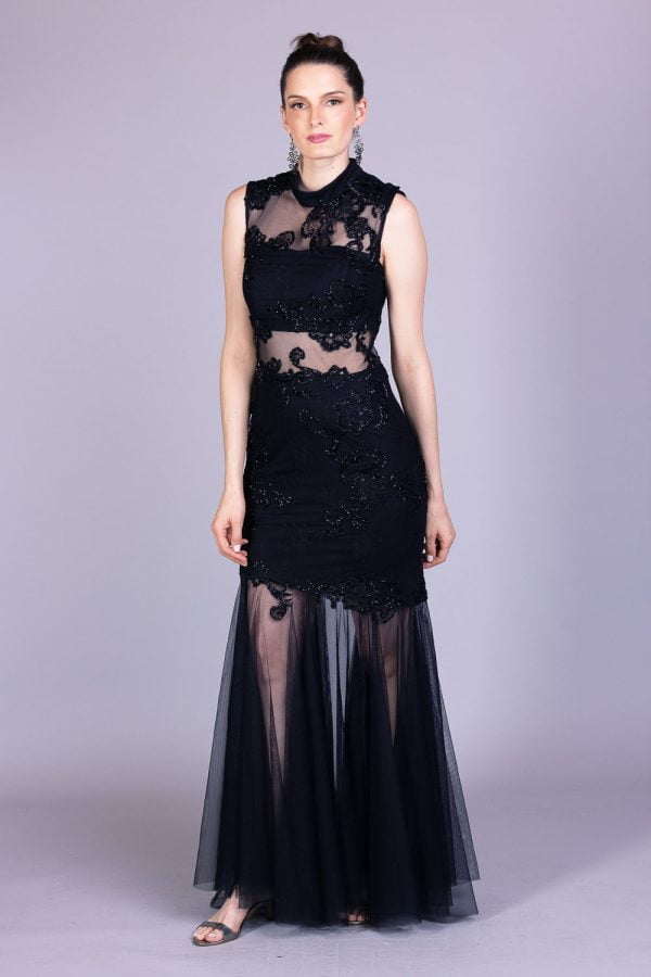 Modelo que exala sofisticação com sua modelagem sereia em preto, realçando as curvas com elegância. O decote frente única, bordado à mão, e as transparências estratégicas garantem um visual moderno e impactante.