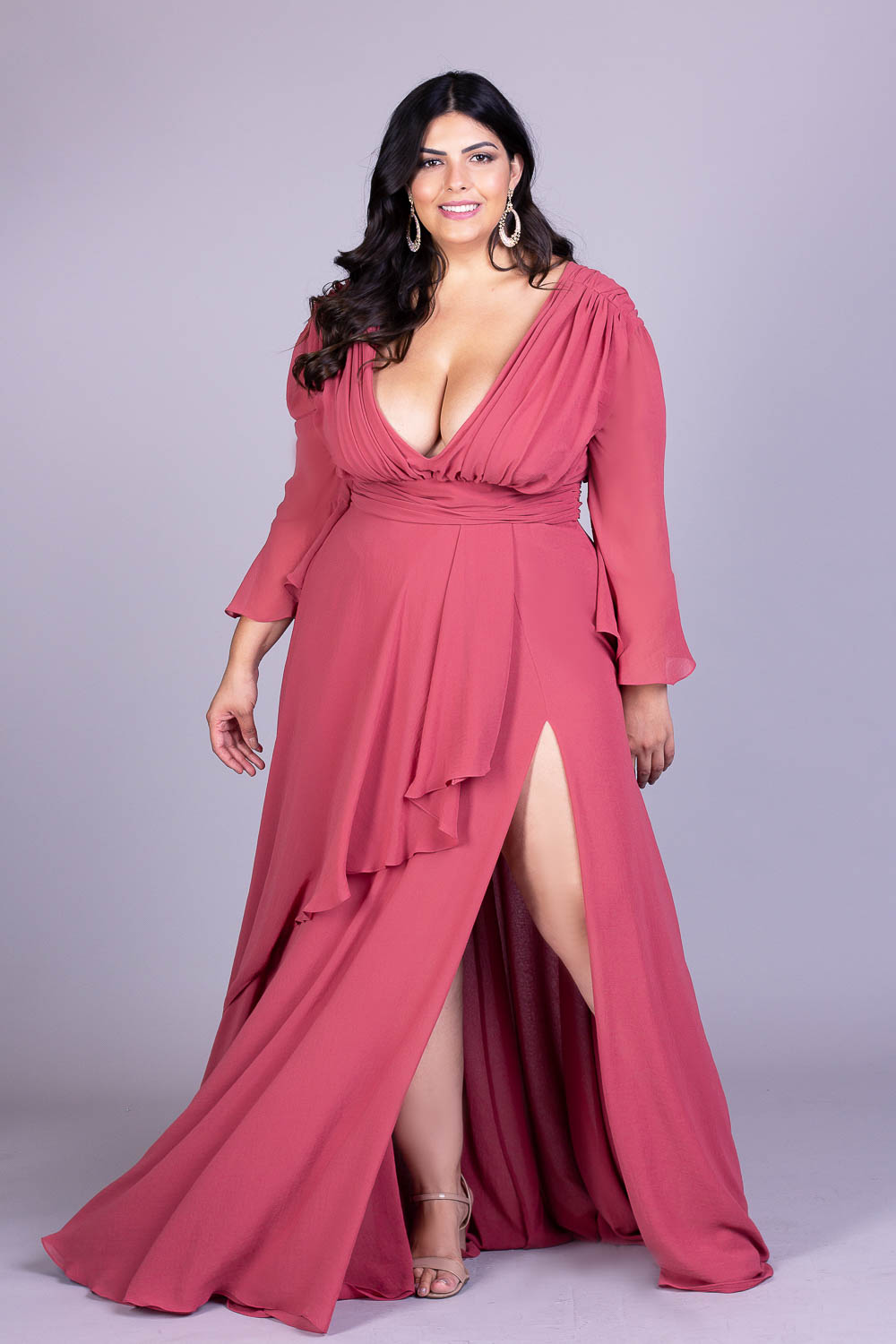 O Vestido de Festa Plus Size Pausineh, em tom vermelho suave, tem decote em V, mangas delicadas e saia esvoaçante em mousseline. Uma peça clássica e elegante para ocasiões especiais.