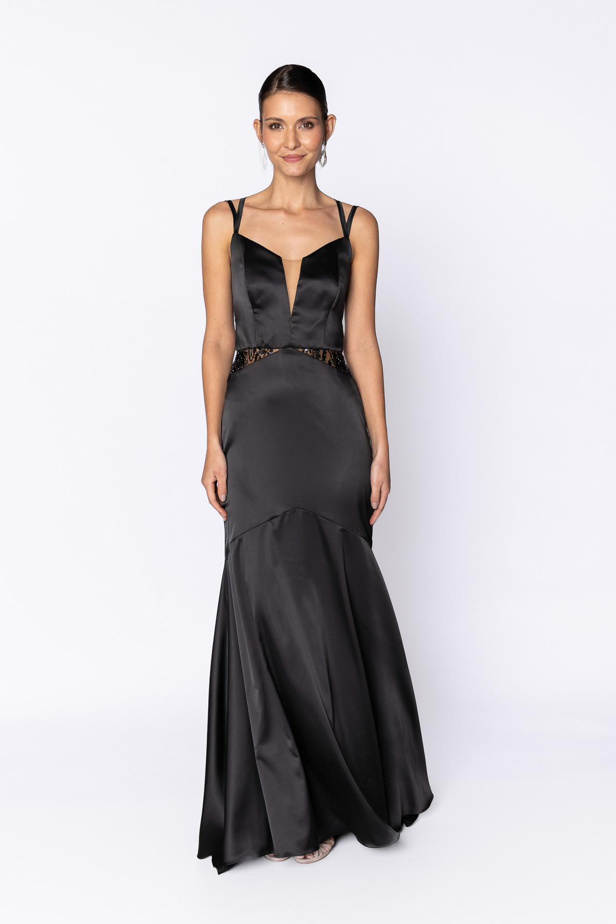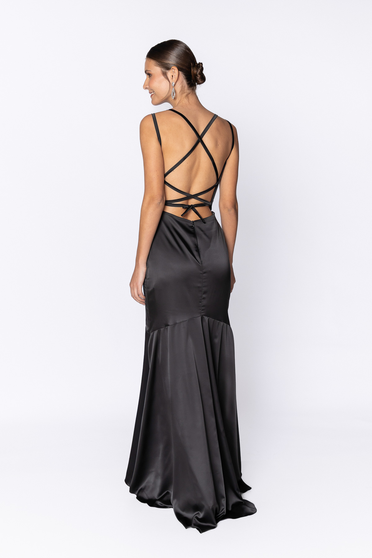 Vestido de festa longo em cetim na cor preto, o modelo Ingrid Jay com decote em V na frente e ousado decote nas costas, é perfeito para você arrasar nas melhores ocasiões como bailes de gala ou celebrações.