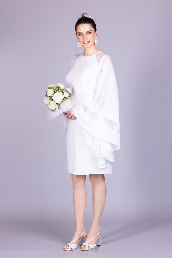 Vestido curto de noiva branco com sobrecapa com detalhes de renda