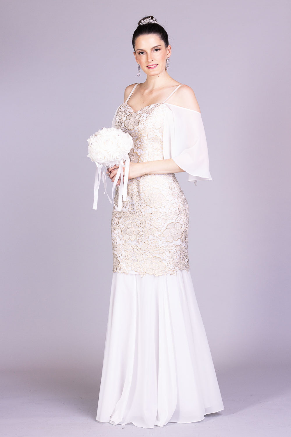 Vestido de noiva longo que vira curto, com mangas que tira as mangas, sendo alterado pelo próprio usuário