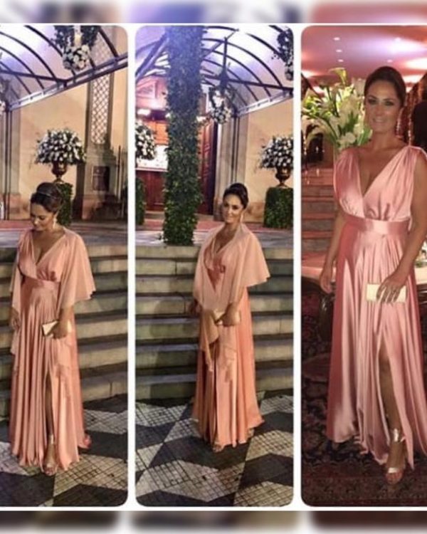 O vestido de festa Lily é um modelo longo de cetim na cor rosa chiclete, com decote v e costas abertas.