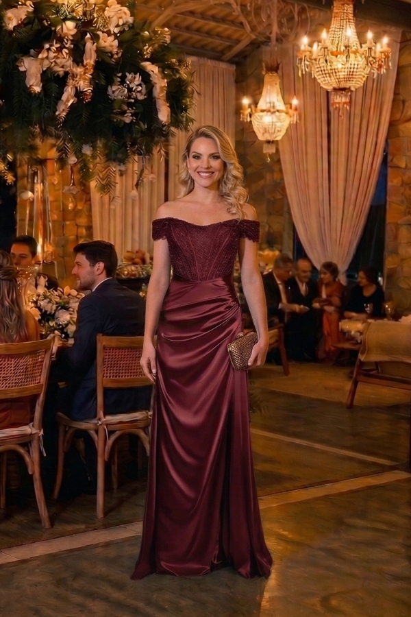 Vestido longo em cetim marsala com decote ombro a ombro, corpo estruturado com bordado manual e fenda frontal. Ideal para formandas, madrinhas e convidadas de eventos noturnos.