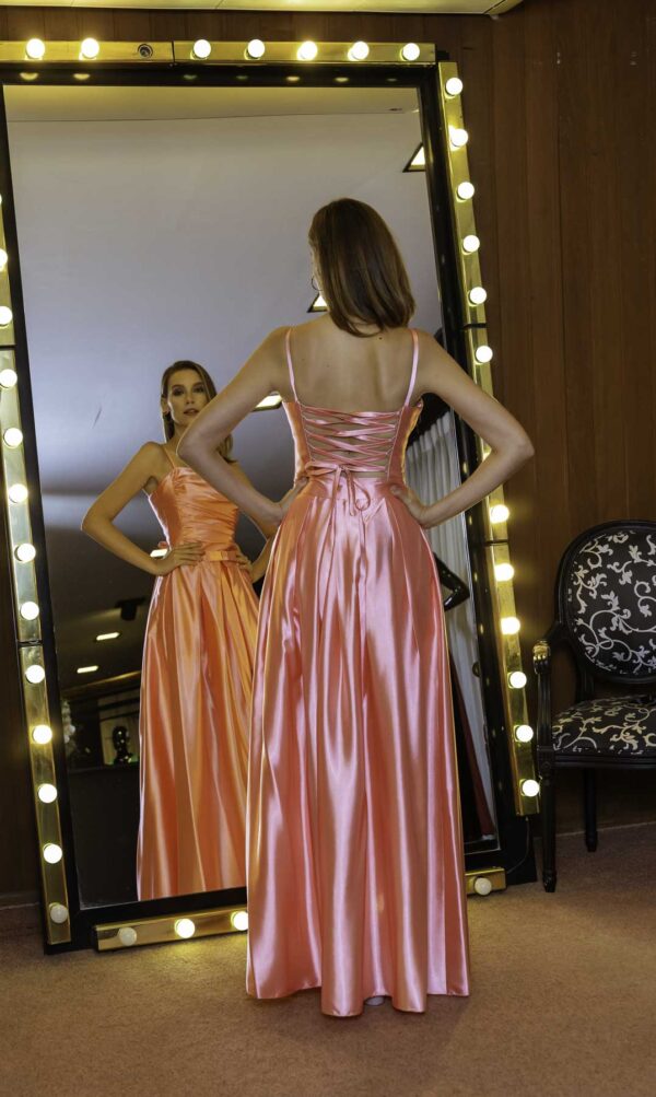 O detalhe de trançado corselet ajustável destaca a cintura com elegância, proporcionando um visual estruturado e sofisticado. A tonalidade rosa transmite romantismo e modernidade, tornando esse modelo uma excelente escolha para madrinhas, formandas e convidadas que desejam um vestido marcante e funcional para casamentos, formaturas e eventos especiais.