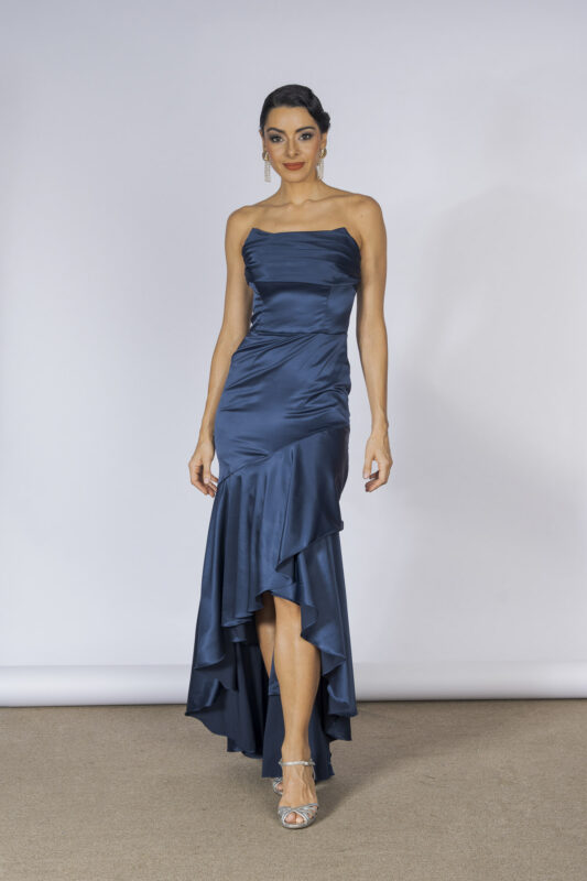 O Vestido Hagla traz o charme dos babados e a elegância do tomara que caia, com barra assimétrica e movimento fluido. Ideal para quem deseja um visual imponente sem exagero.