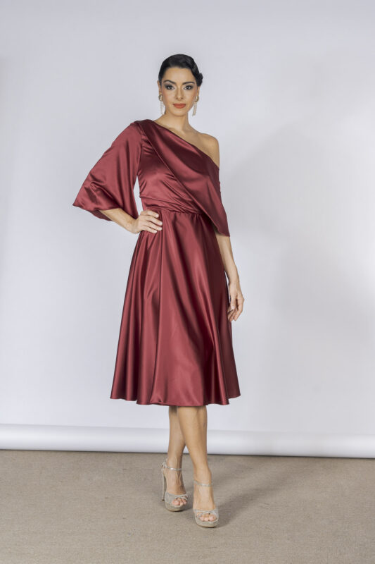 O modelo Amissi, em tom vinho profundo, tem decote de um ombro só e mangas 3/4, que criam um visual contemporâneo e requintado. A fluidez do cetim garante caimento impecável e movimento leve.