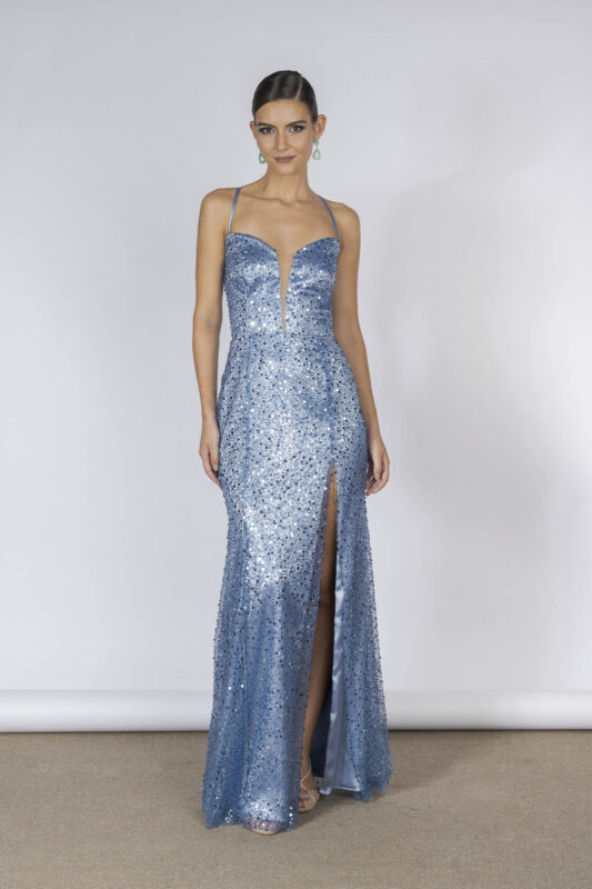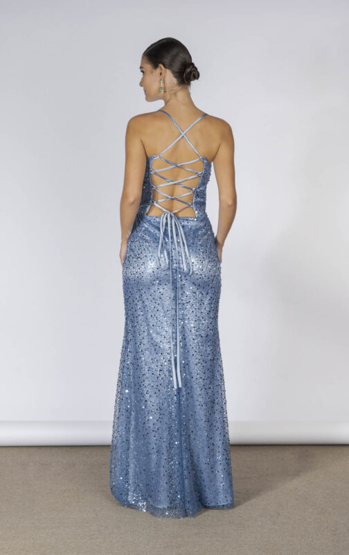 O modelo ainda conta com fenda frontal e decote discreto, equilibrando sensualidade e classe. Ele é perfeito para formandas, madrinhas e convidadas de casamento.
