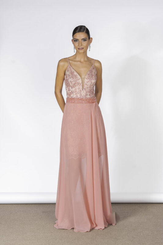 A tonalidade rose reforça o romantismo da peça, enquanto a modelagem bem ajustada no busto e solta na saia cria um visual equilibrado entre delicadeza e imponência. O caimento favorece a silhueta sem marcar, tornando o vestido confortável e encantador para longas celebrações.