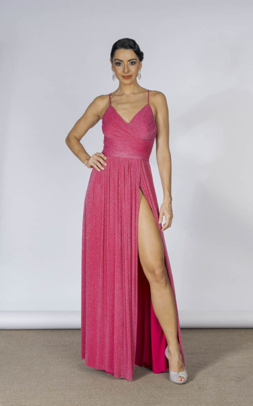 Confeccionado em lurex rosa com brilho discreto, o vestido capta a luz com delicadeza, realçando o movimento do corpo. O caimento é fluido, mas mantém uma estrutura sutil que favorece diferentes tipos de silhueta, com elegância e discrição.