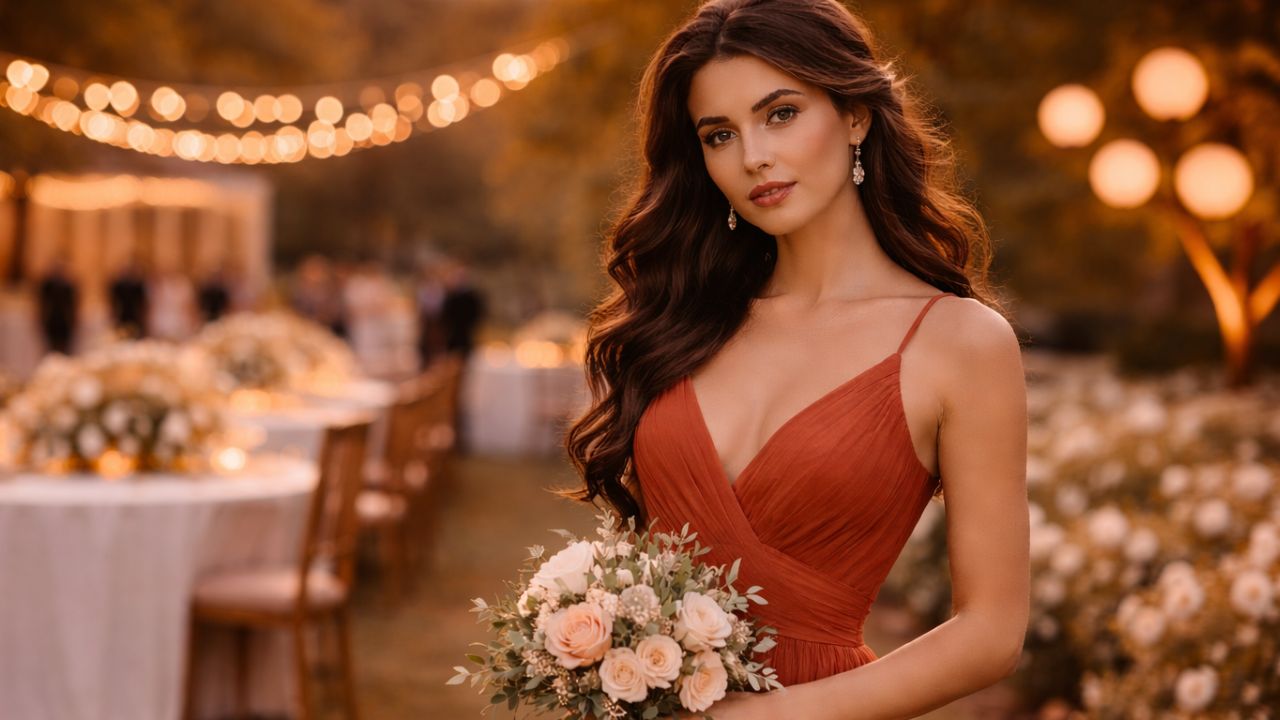 Em casamentos que transitam entre cerimônia e festa, a versatilidade do vestido de madrinha terracota se torna uma vantagem.